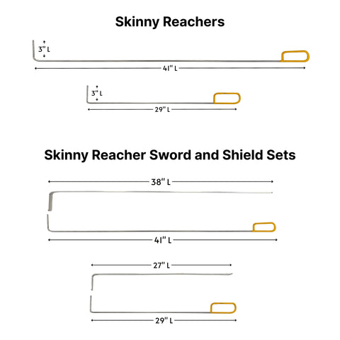 Merchandising made simple. The Skinny Reacher set combines two purpose-built tools: the Sword, for pulling forward and aligning deep-set products, and the Shield, for straightening, zoning, and protecting your items as you work. Together, they enable a single employee to face shelves, fix displays, and keep aisles retail-ready in seconds — without bending, straining, or knocking products over.